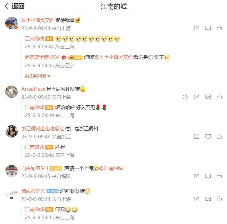 在该条微博的评论区,江南的城也对网友的留言进行了回复。其中有球迷提到上海男篮,江南的城以非常含蓄的方式给予了暗示,并表示不是上赛季的四强球队。除此之外,江南的城也否认了浙江男篮的可能性。