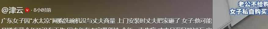 [1]官方新闻2026年1月9日《广东女子因"水太凉"网购洗碗机没与丈夫商量上门安装时丈夫把家砸了 女子:他可能是嫌弃我今年还没有工作 因去年在老家带俩娃 今年一直生病 丈夫月薪轻松过万 安装前刚吃完海底捞#》